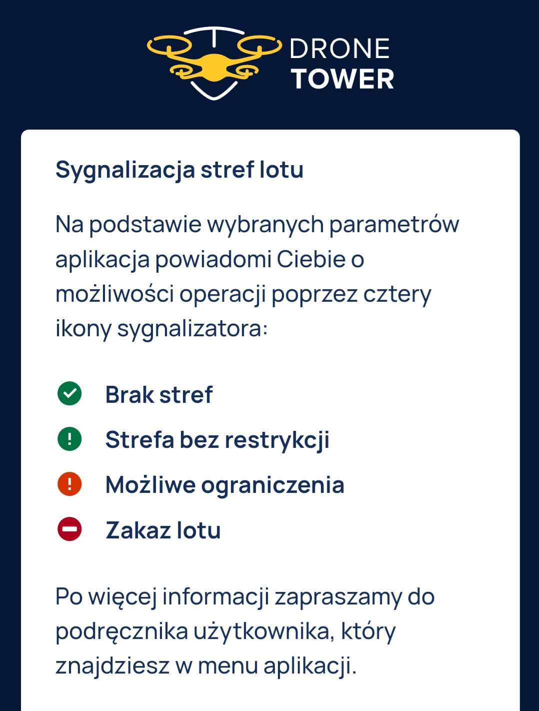 6. Każdy lot dronem powinien zostać zgłoszony przed jego wykonaniem! No może nie każdy (jeśli zamierzasz latać tylko w zamkniętych pomieszczeniach to nie ma takiej potrzeby)… Nie mniej – służy do tego aplikacja mobilna DroneTower, którą należy pobrać ze sklepu Google Play lub Apple Store z aplikacjami na dedykowany system operacyjny Twojego smartfona. Tutaj też musisz założyć konto użytkownika i zweryfikować je numerem telefonu komórkowego.