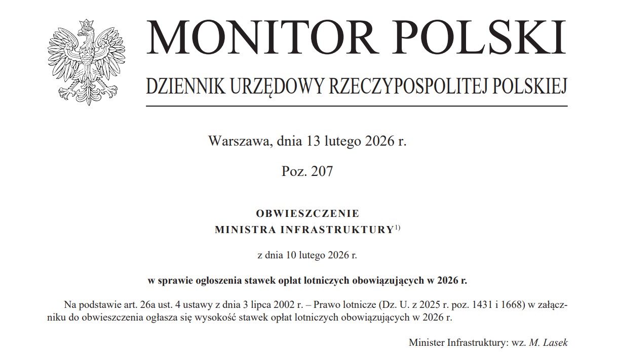 W dniu 13 lutego 2026 r. zostało opublikowane w Monitorze Polskim Obwieszczenie Ministra Infrastruktury z dnia 10 lutego 2026 r. (poz. 207) w sprawie ogłoszenia stawek opłat lotniczych obowiązujących w 2026 r. Podwyżka opłat wyniosła 3,6% czyli tyle, ile wyniosłą inflacja w 2025 r.