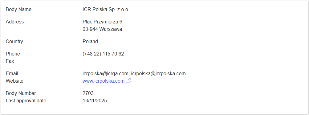 - ICR Polska Sp. z o.o. – nr 2703, ostatnia data zatwierdzenia organizacji: 13/11/2025
