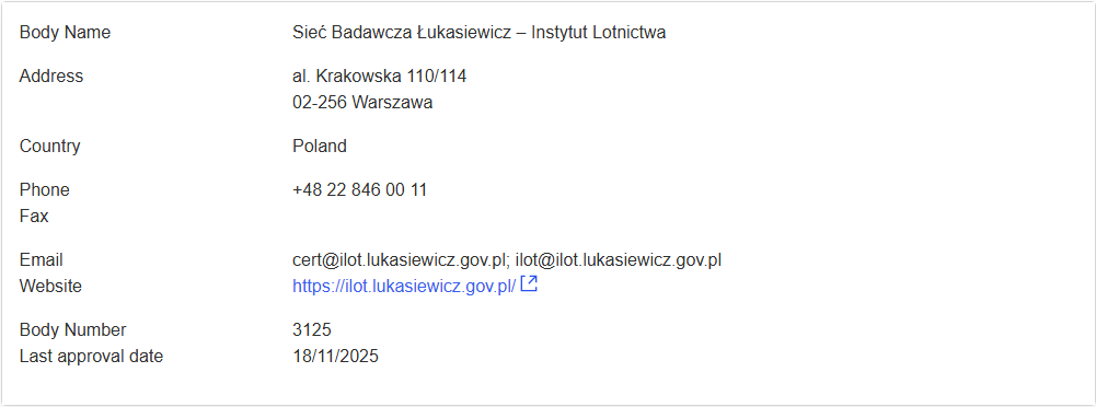 - Sieć Badawcza Łukasiewicz – Instytut Lotnictwa – nr 3125, ostatnia data zatwierdzenia organizacji: 18/11/2025