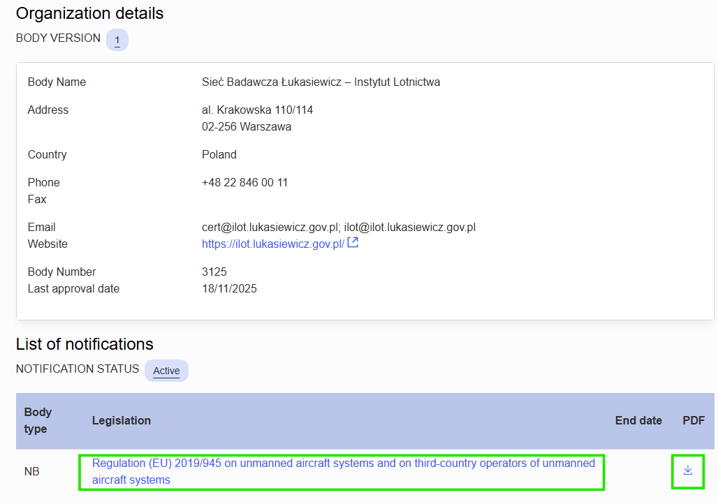 Szczegóły notyfikacji są dostępne na podstronie każdej z organizacji w powyżej wskazanym rejestrze, można pobrać potwierdzenie notyfikacji poszczególnych jednostek w PDF.