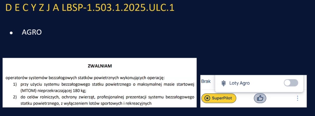 - zwolnienie dla operacji agrolotniczych i demonstracyjnych dla dronów do 180 kg masy